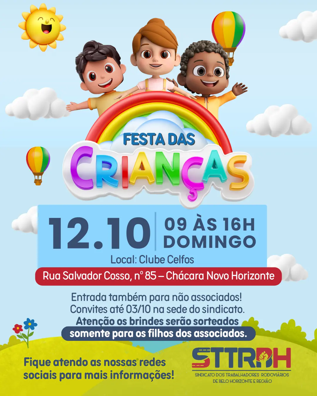 No dia 12 de outubro, o Sindicato dos Rodoviários de BH promove a Festa das Crianças 2025, no Clube Celfos, de 09h às 16h. Será um dia inteiro de lazer, brincadeiras e confraternização para nossos associados e suas famílias. A entrada também está aberta para não associados, mas os brindes serão sorteados exclusivamente para os filhos dos associados. Convites disponíveis até o dia 03/10 na sede do sindicato. Não perca essa grande celebração da infância!