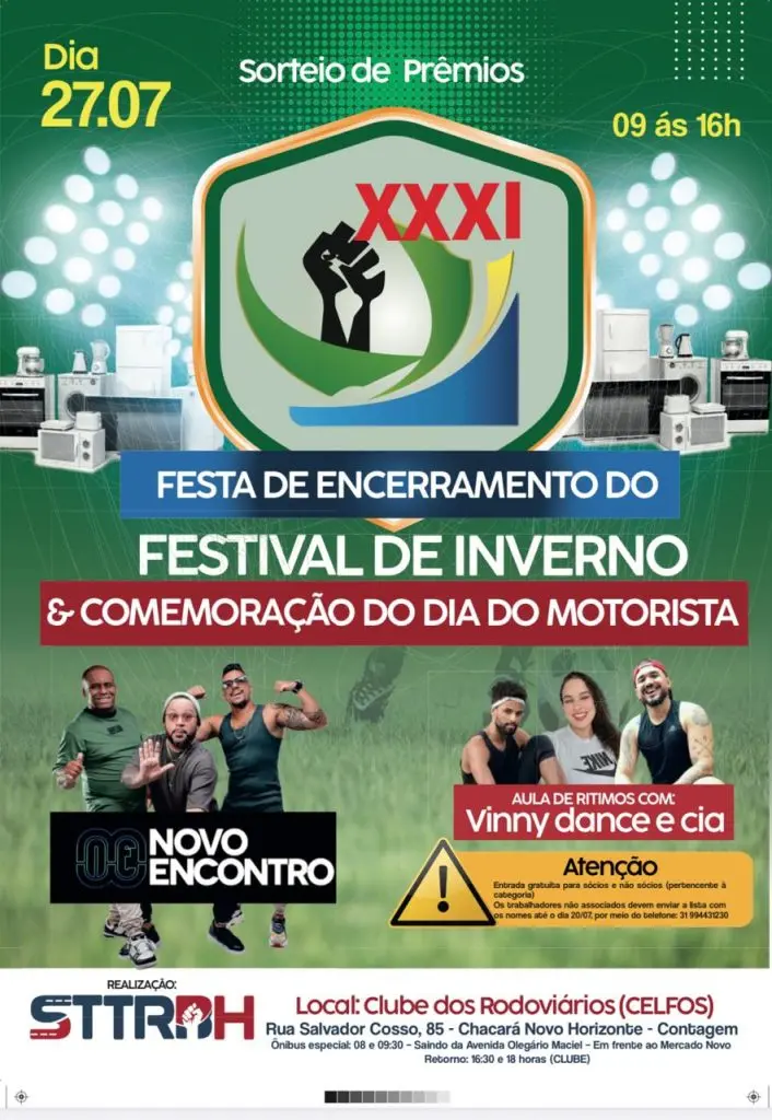 No dia 27 de julho, o STTRBH convida todos os trabalhadores e trabalhadoras do transporte para uma grande celebração que marcará o encerramento do XXXI Festival de Inverno e a Comemoração do Dia do Motorista.