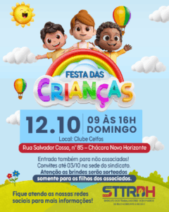 No dia 12 de outubro, o Sindicato dos Rodoviários de BH promove a Festa das Crianças 2025, no Clube Celfos, de 09h às 16h. Será um dia inteiro de lazer, brincadeiras e confraternização para nossos associados e suas famílias.